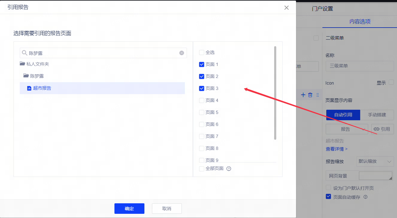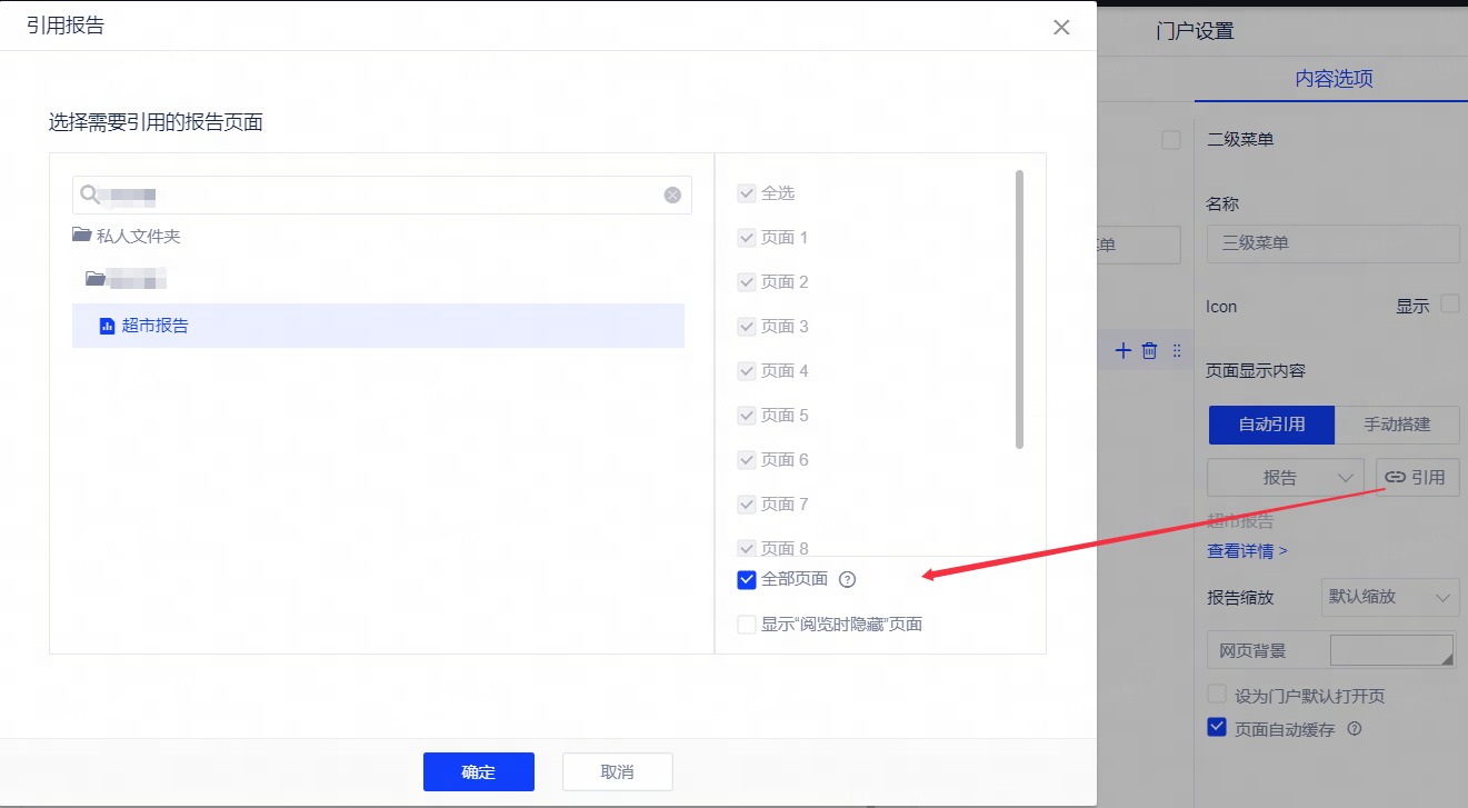(2)菜单:在菜单中引用报告时,支持报告页面多选,并支持引用报告的全部页面