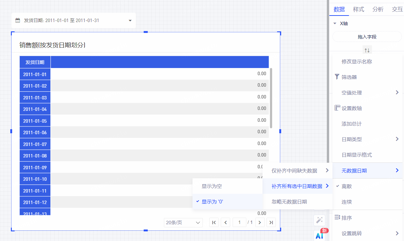 (2)日期字段的无数据日期设置:新增补齐所有选中日期数据;并增加对「年-月-日-时-分-秒」粒度日期的支持
