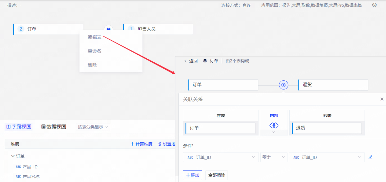 支持在数据模型编辑界面左上角开启关系模式