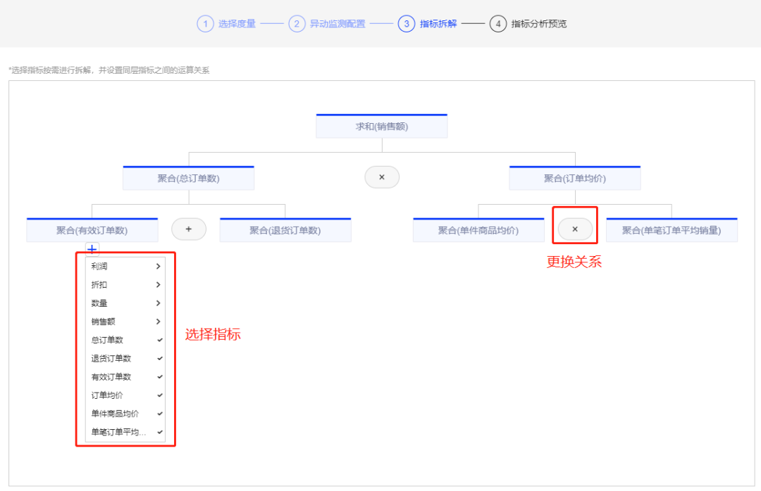全部的拆解过程只需在页面上简单勾选指标、更换指标之间的运算关系即可完成,如下图所示:
