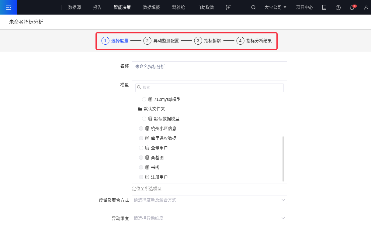 (2)选择新建指标分析,设置步骤包括:选择度量-异动监测配置-指标拆解-指标分析预览;