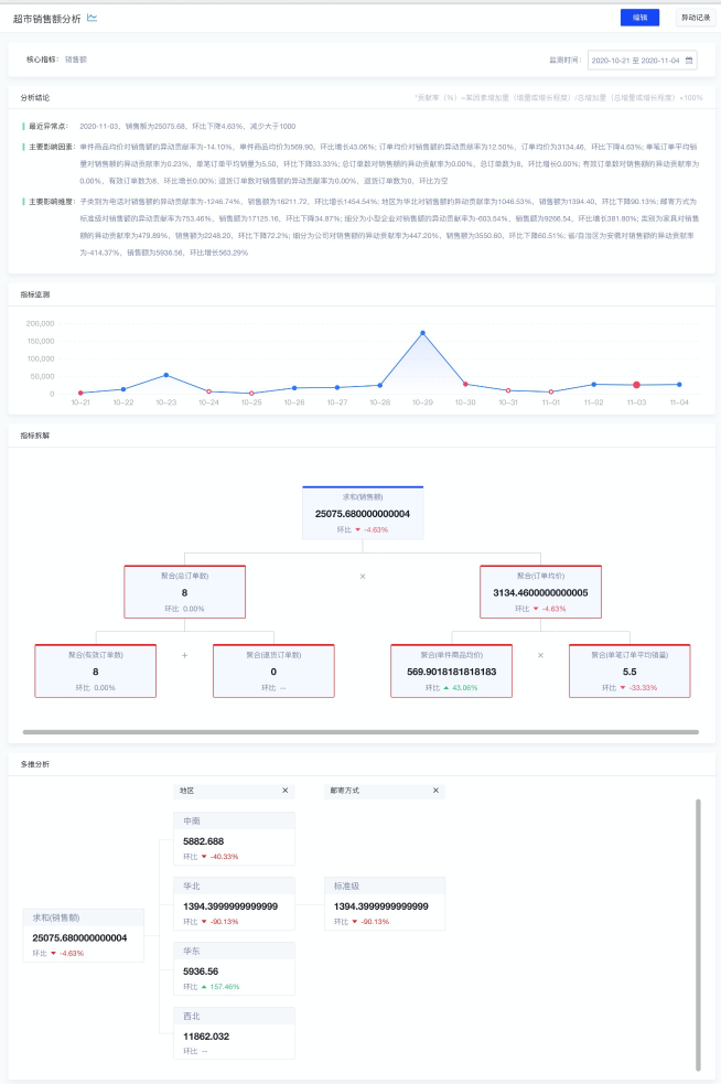 通过指标拆解和多维分析智能分析检测核心指标的异动及其异动的根因。实现异常指标的自动归因,节省盲目找原因的时间,提高决策效率。