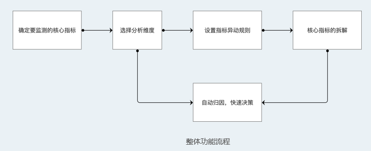 首先要确定观测的核心指标,比如电商行业的GMV(成交额);其次设置核心指标的异动规则,即什么情况下认为该指标有异常,比如销售额急剧下降的时候,管理者们不能坐以待毙,必然要采取有效措施应对,及早发现及早探查及早改变销售额下降的现状。