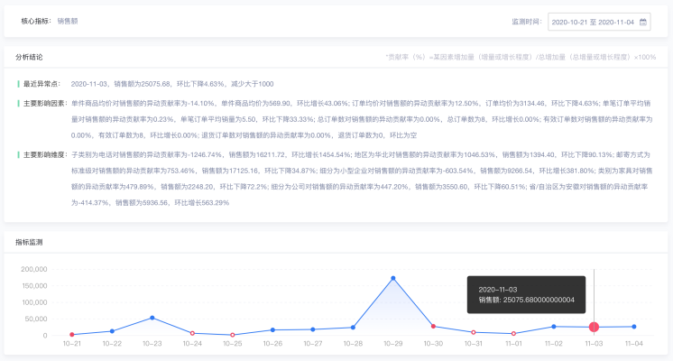 最近异常点发生的时间,引起该异常的主要影响因素和主要影响维度,从异动贡献率(贡献率=某因素增加量(增量或增长程度)/总增加量(总增量或增长程度)×100%)这个指标来自动判断哪些因素(拆解的指标)和维度(分析维度的成员项)对指标异动产生最大影响,您可以根据该结论快速定位异常原因。