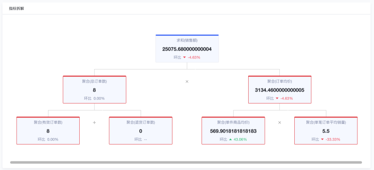根据用户配置的指标拆解图将核心指标一步步分层拆解,自动计算核心指标及每一个拆解的子指标的具体数值及环比值,快速观测各指标的变化情况。