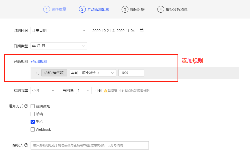 包含监测时间、日期类型、异动规则、检测频率、通知方式、接收人。当天的销售额数据如果比前一天降低大于1000,则该指标有异常,除了设置异动规则,也可设置通知方式,从系统通知、邮箱、手机等渠道触达。