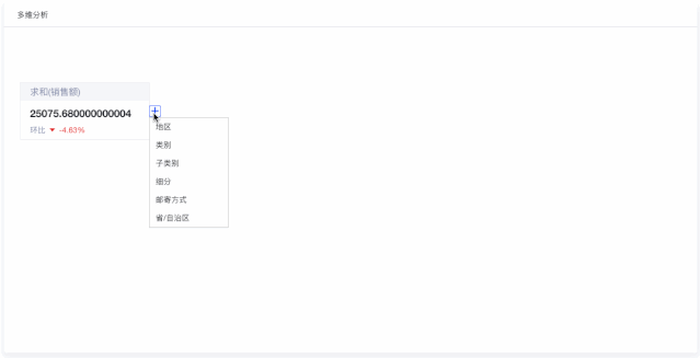 (5)多维分析:度量指标卡,展示数值及同环比,点击分解,下拉选择分解的维度;