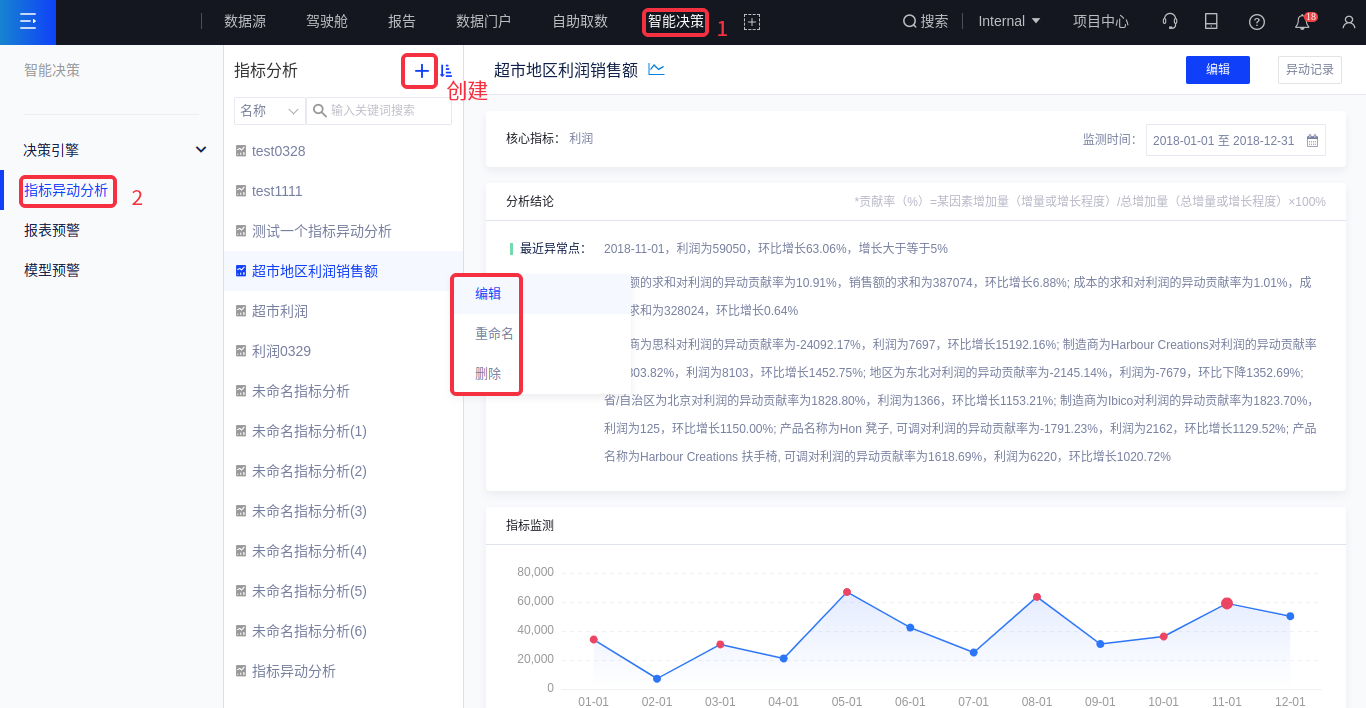(1)您可在[智能决策-指标异动分析]模块中查看记录,可进行创建、编辑、删除、搜索等操作;