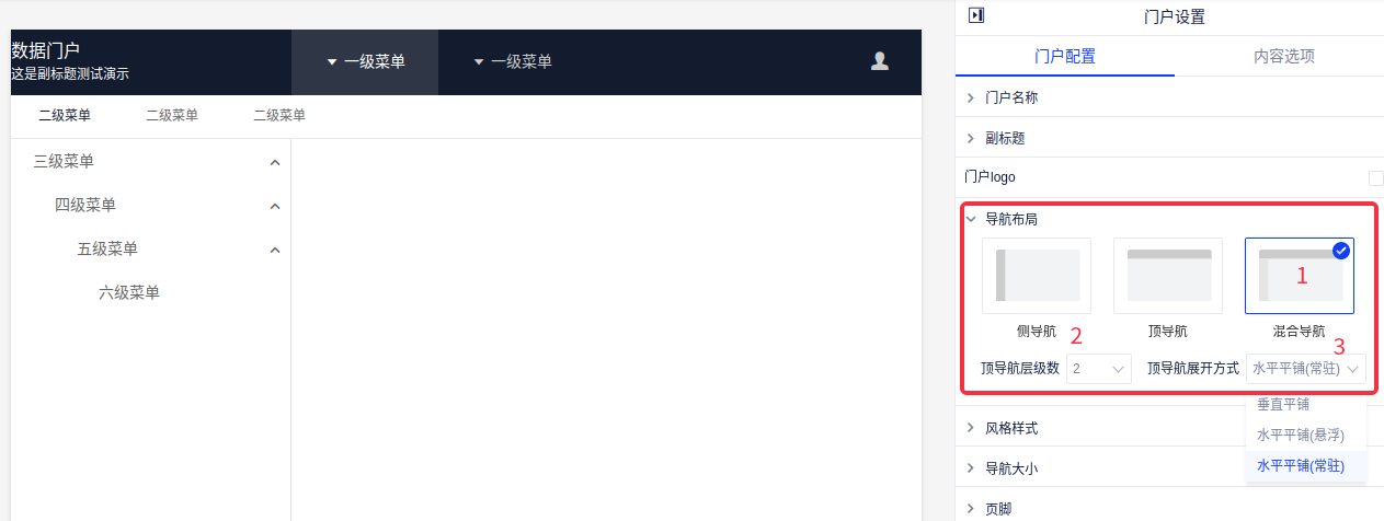 - (4)导航布局:当前支持侧导航、顶导航以及混合导航三种模式