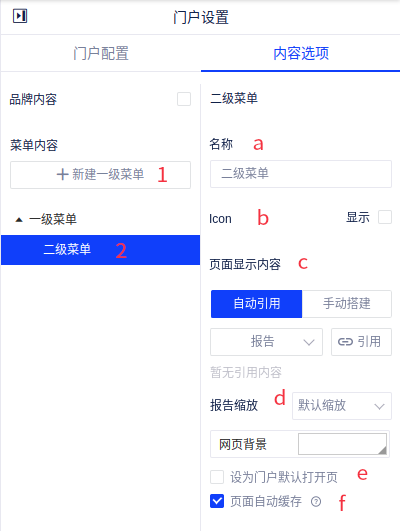 c 页面显示内容:当前菜单支持引用报告、大屏、指标异动分析、数据填报、复杂报表、工作台、自助取数、导出管理(取数导出管理(定时/非定时)、报告导出管理)以及外部链接。若引用某内容,下方显示引用该内容的路径,点击查看详情,跳转至该内容所在页面