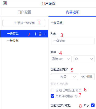(1)新建一级菜单:点击后将在导航栏新增一个一级菜单