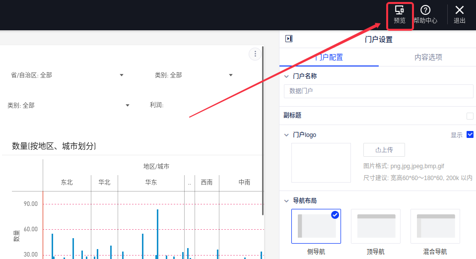 当您的数据门户编辑完成后,可点击顶部工具栏的“预览”按钮,在新的标签页预览效果。