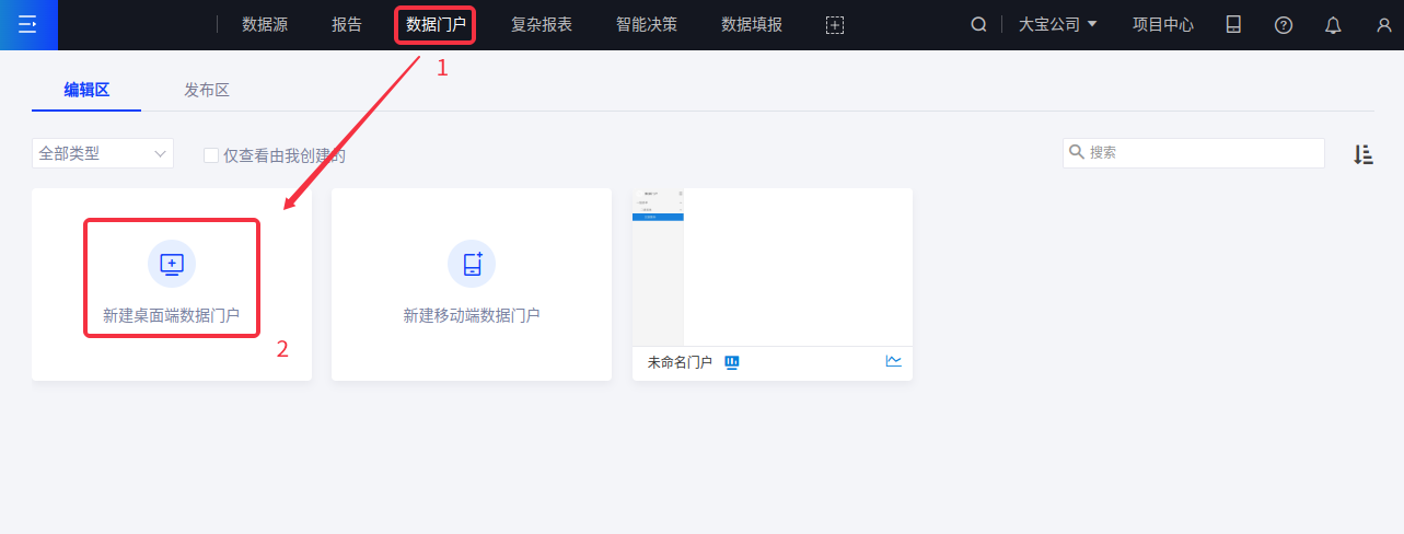 以创作者身份进入本产品,点击「数据门户>编辑区>新建桌面端数据门户」可创建新的桌面端门户,如下图所示: