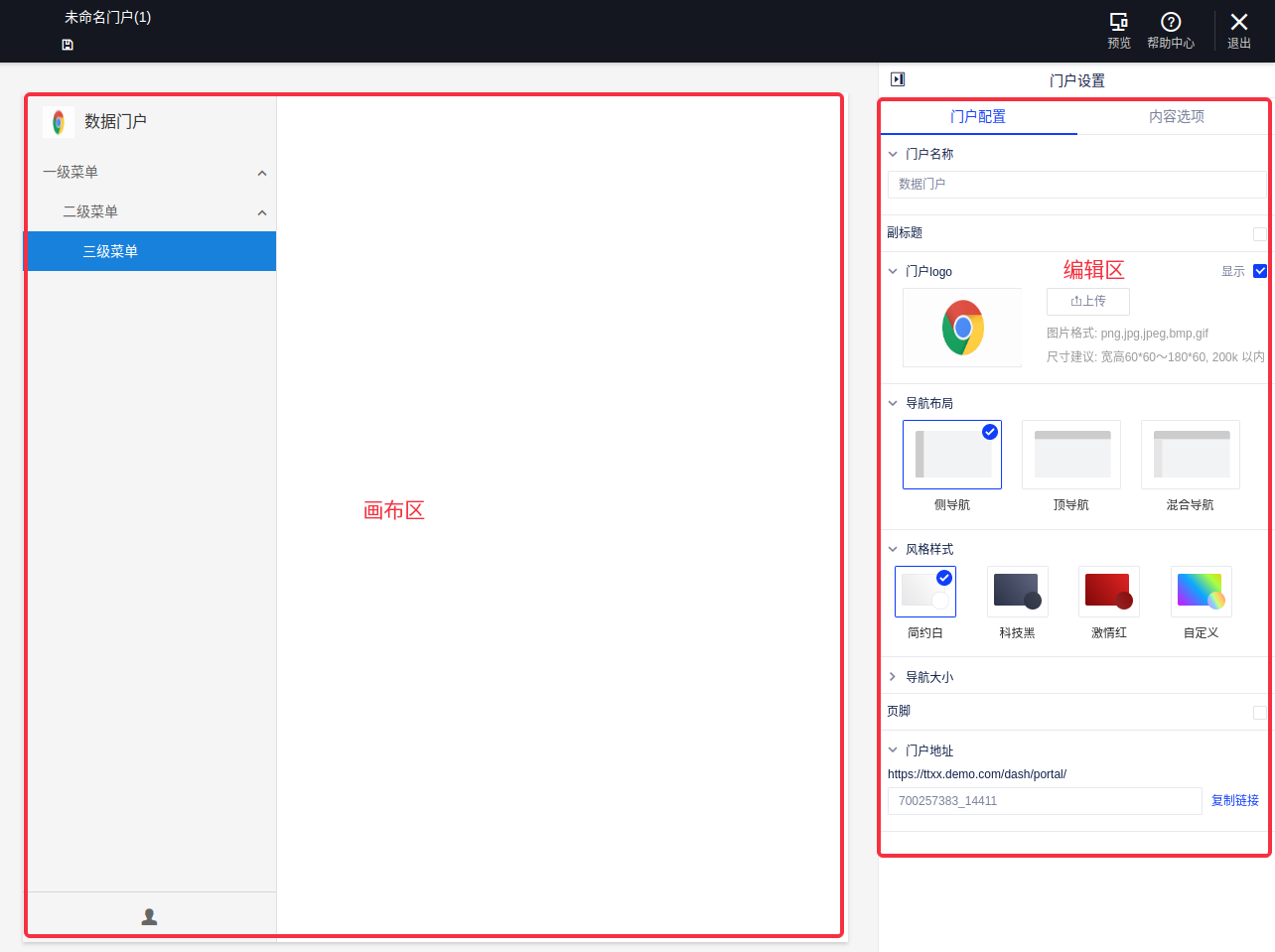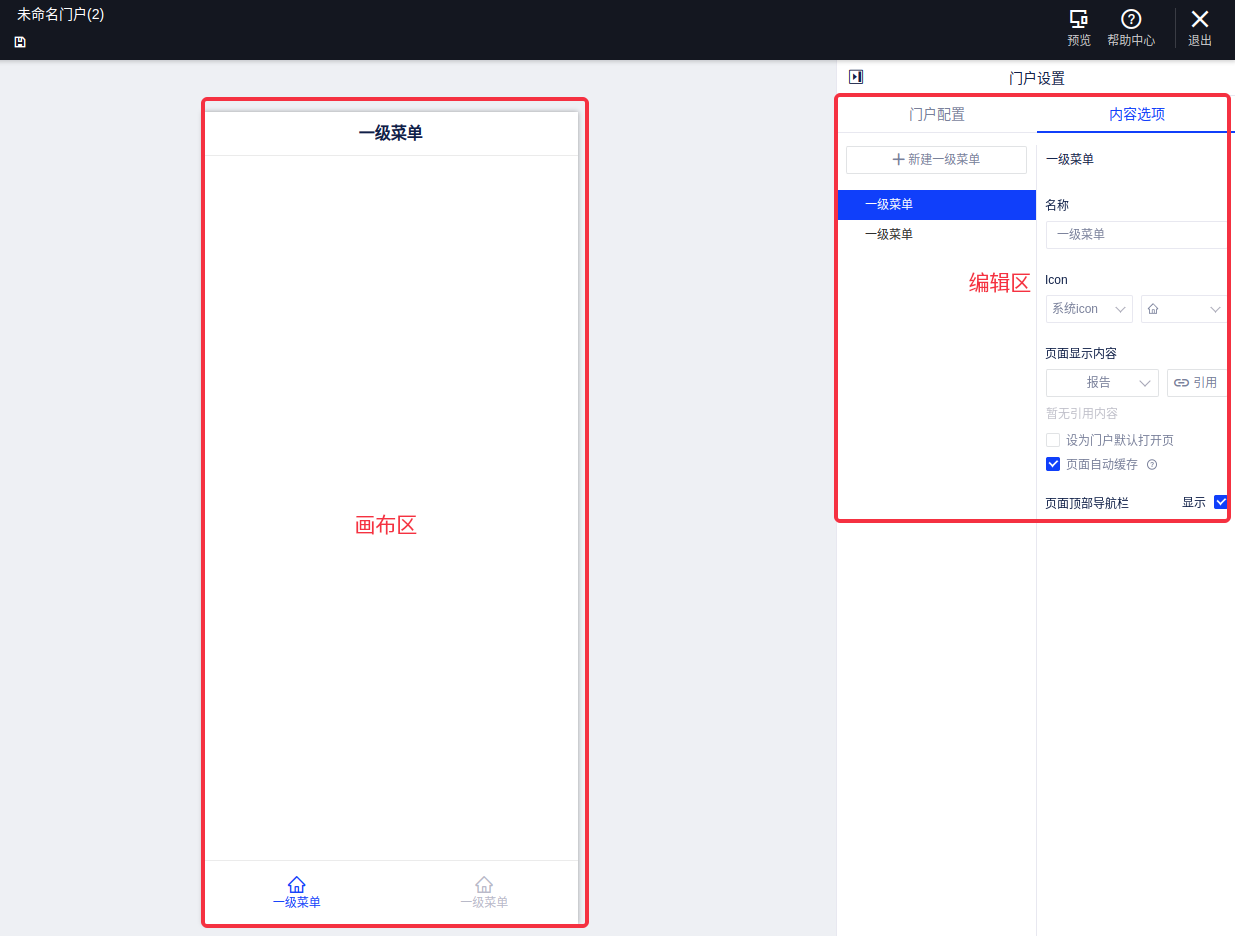 - 顶部操作栏支持对门户进行保存、预览、退出等全局操作;