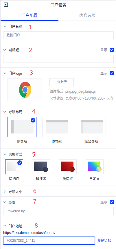 - (3)门户logo:尺寸建议为60X60或180X60像素,图片大小在200kb以内