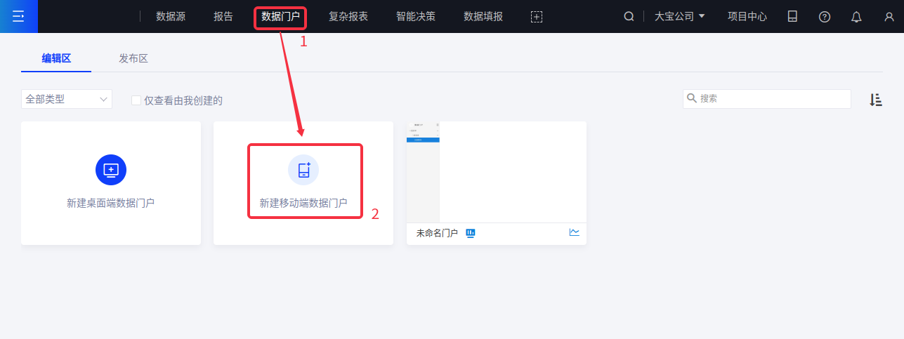 以创作者身份进入本产品,点击「数据门户>编辑区>新建移动端数据门户」可创建新的移动端门户,如下图所示: