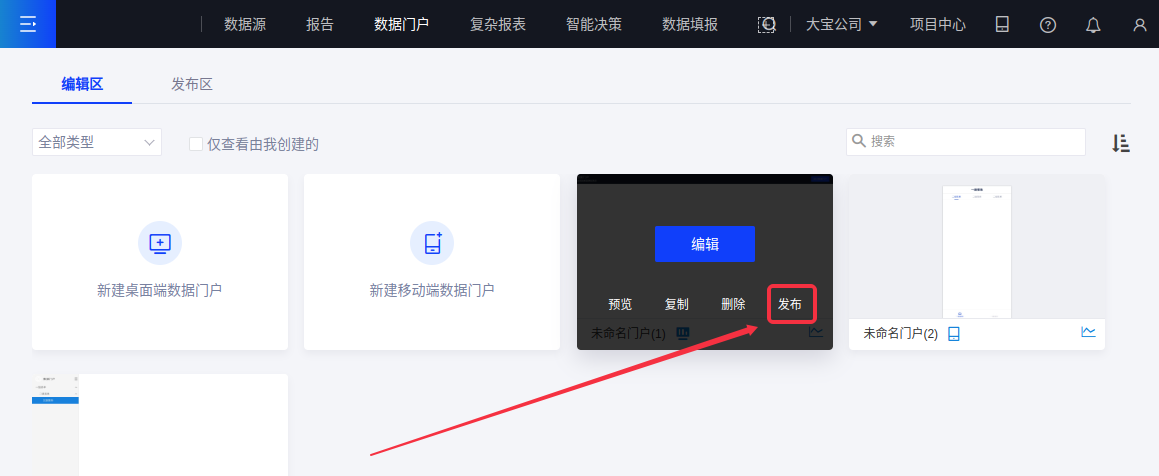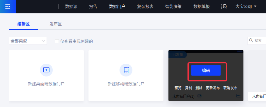 (1)进入数据门户主页,在编辑区找到您制作的门户,鼠标hover后点选“发布”按钮;