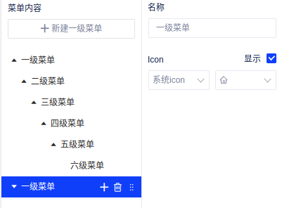 (4)Icon:设置显示系统icon或自定义icon(自定义icon建议尺寸为20X20,100kb以内),移动端仅一级菜单可设置icon
