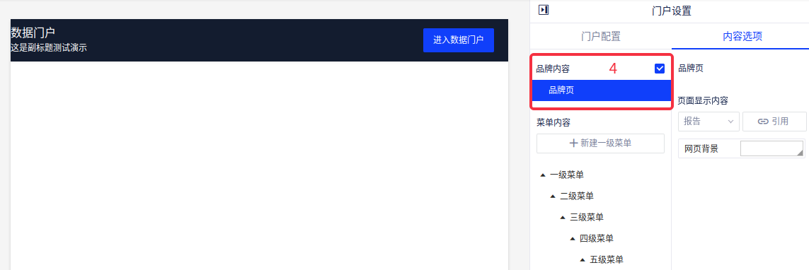(4)品牌页:默认不勾选,勾选后显示品牌页,左侧切换至品牌页内容;开启品牌页后点击logo和标题,可快速切换至品牌页;页面内容可选择:报告、大屏、外部链接,默认选中报告。