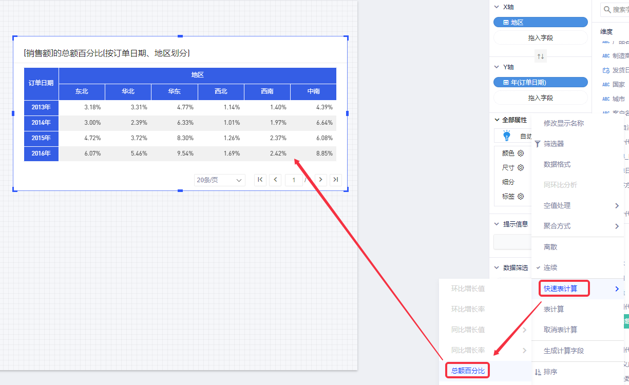 我们希望观察各地区销售额的占比,但原始数据里并没有这样的信息,这时可以借助表计算得到。如下图所示,使用了总额百分比表计算。
