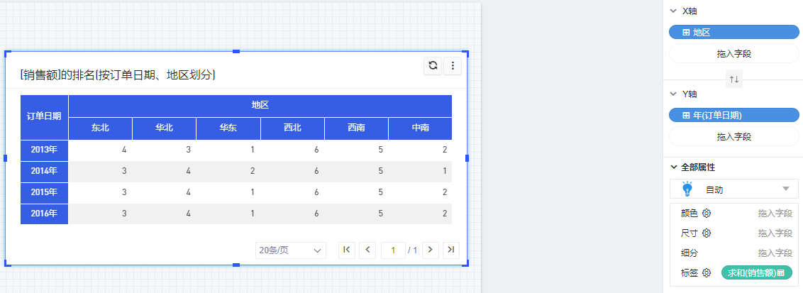 但如果我们对调一下,把“地区”变为分区,“年”变为寻址,那么我们得到的就是每个地区下各年的销售额排名,如下图所示: