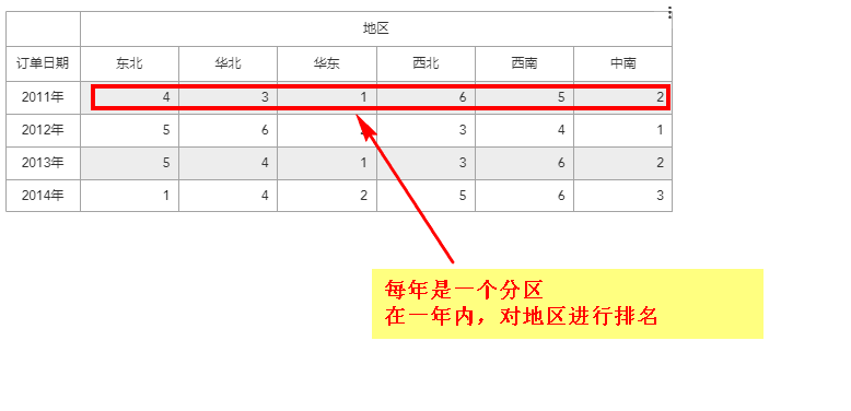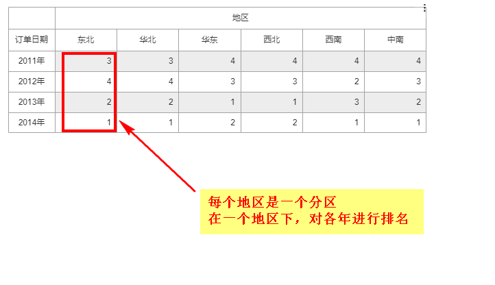 比如我们需要在对每年的地区进行排名,分区就是“年”,寻址是“地区”,如下图所示:
