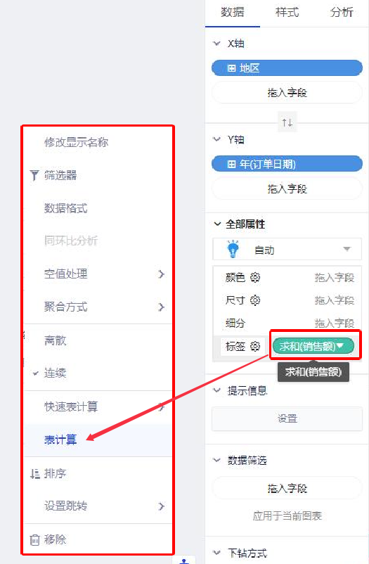 在右侧配置区域,选中度量字段后点击右键(或者鼠标Hover上去,点击下拉菜单),在弹出的菜单内选择进入表计算。
