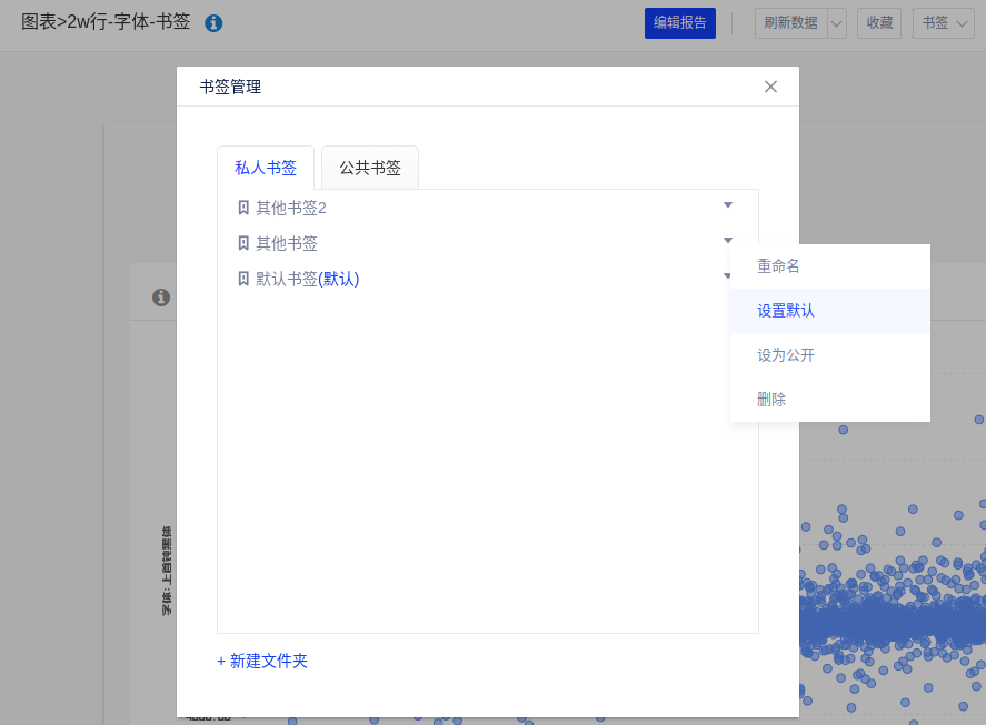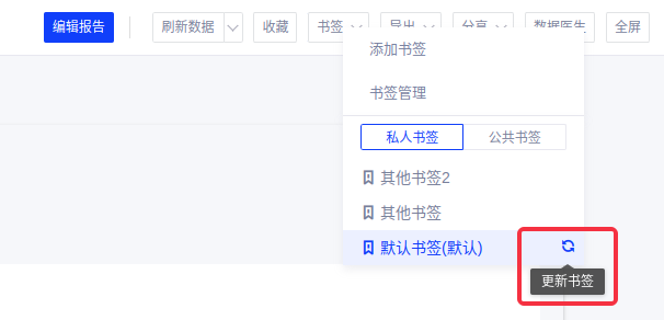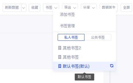 - 支持设置默认书签。在报告列表中访问或者通过该用户的token访问报告时,将自动打开默认书签