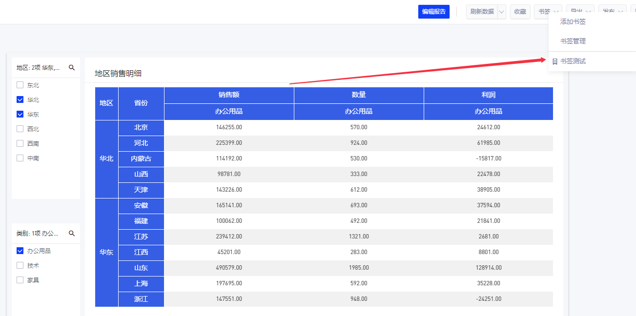 (2)若需要经常查看华北、华东两个地区办公用品的销售额,可以将当前报告的状态保存成一个书签,下次访问书签,报告将自动进入到书签记录的状态(本例中,即地区筛选器选中“华北”和“华东”,类别筛选器选中“办公用品”);