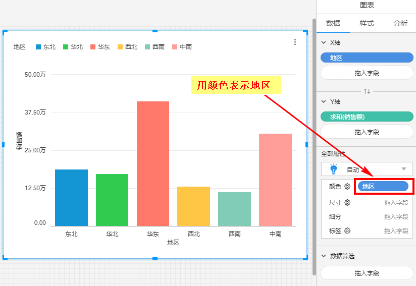 想用颜色表示不同的地区,可直接将“地区”拖入颜色,如下图所示: