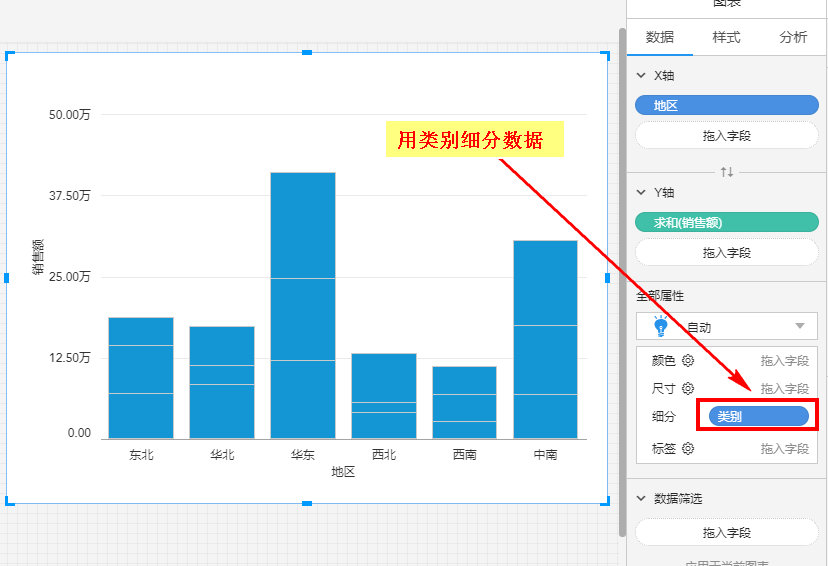 细分指的是对数据的拆分,比如将“类别”拖入细分,会将柱子根据类别分成3段: