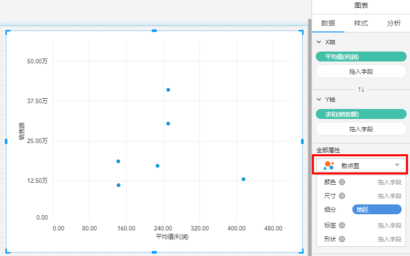 形状只有在绘制散点图时,才会出现。我们可以将“地区”拖入形状,用形状区分不同地区: