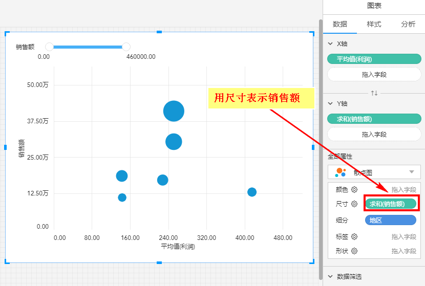 将“销售额”拖入颜色,用尺寸大小表示销售额多少: