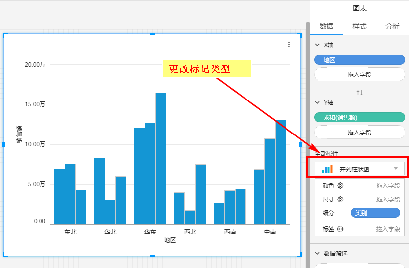 当想用图形属性表达数据时,将数据拖入对应的位置即可,下面通过例子来说明用法。