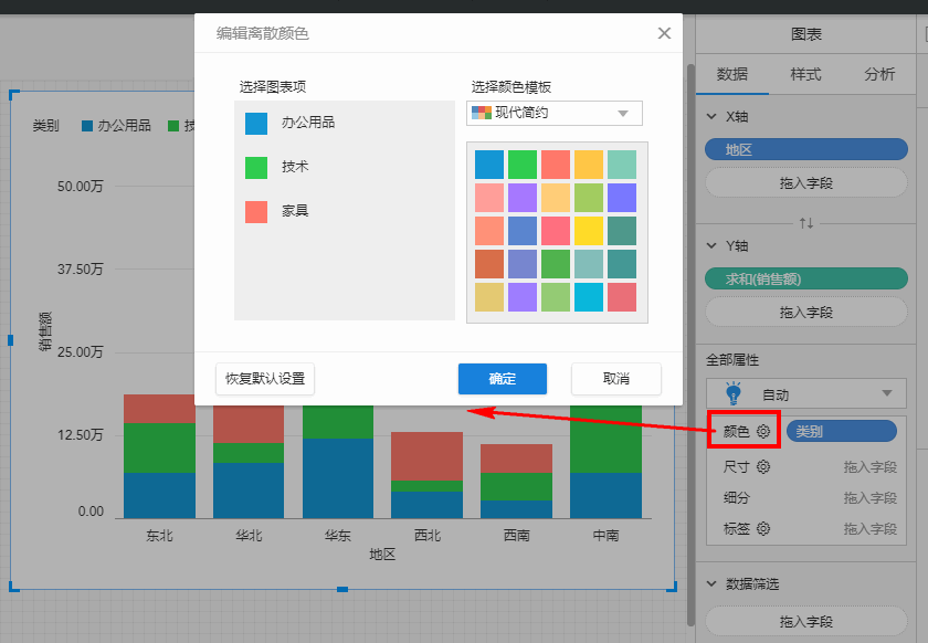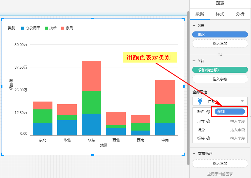 如果将“类别”拖入颜色,则用颜色表示不同类别,会将每根柱子分成颜色不同的三段: