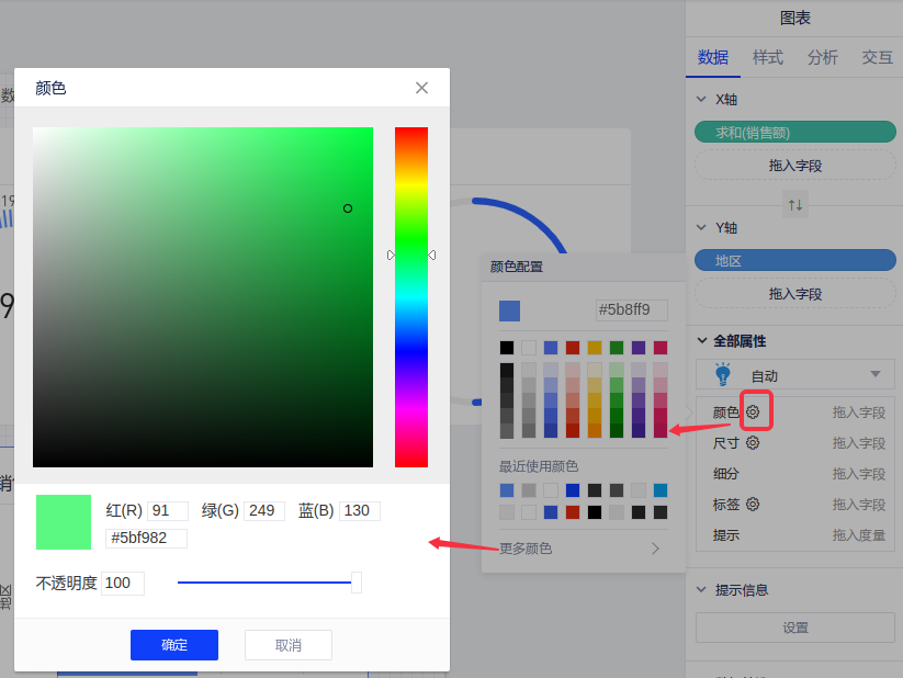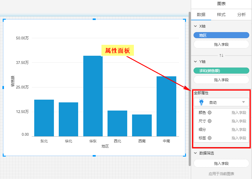 在进行数据可视化时,我们希望用几何对象的图形属性(颜色、形状、尺寸等)直观地表达数据,这时可以借助图表控件的属性面板做到。图表控件的属性面板如下图所示: