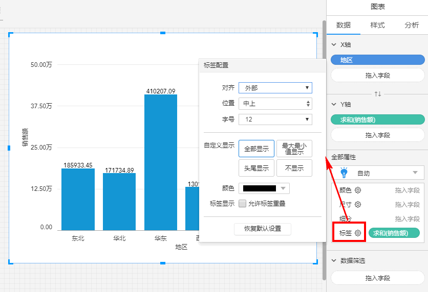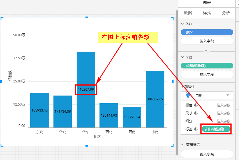 即是在图上显示文字标识,比如将销售额拖入标签: