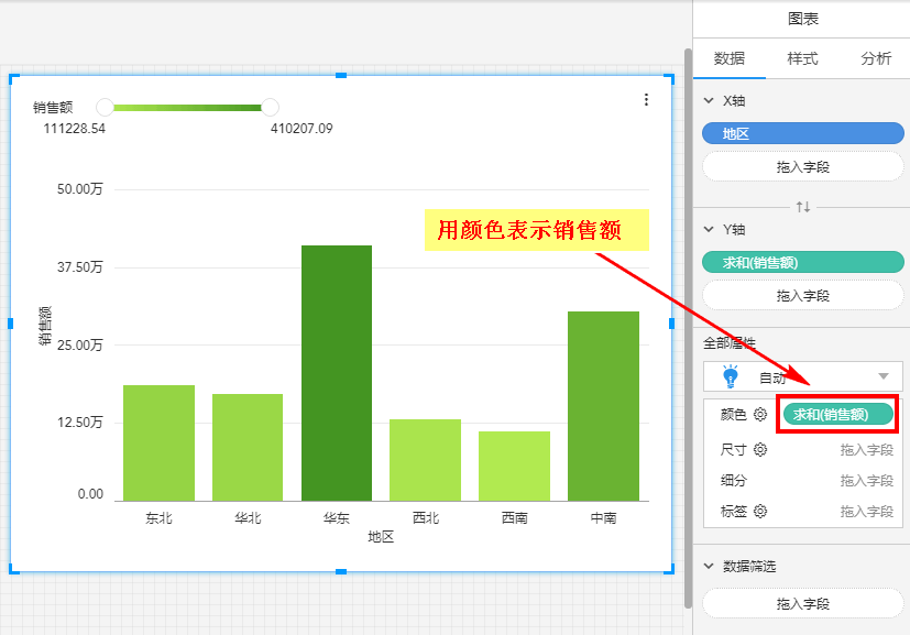 还可以将“销售额”拖入颜色,用颜色深浅表示销售额大小:
