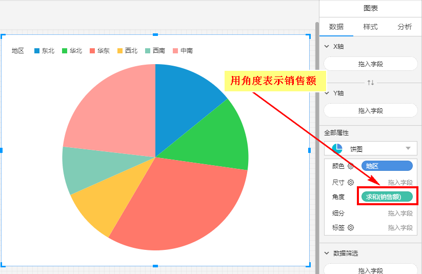 角度只有在绘制饼图时,才会出现。我们可以将“销售额”拖入角度,用扇区的角度大小表示销售额的大小: