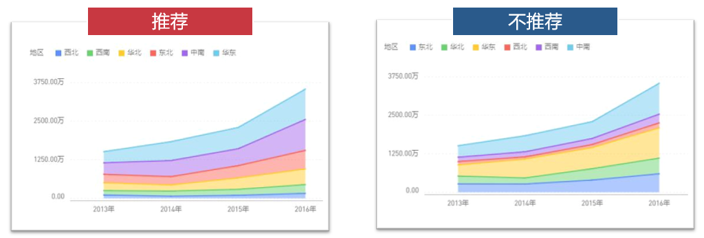 区域图能够表示数据的时间序列关系,和折线图不同的是,面积图能够清晰表示出量。