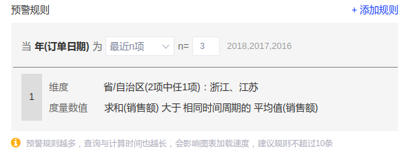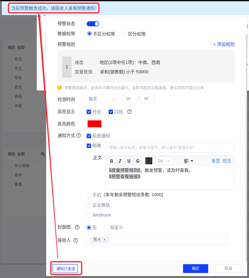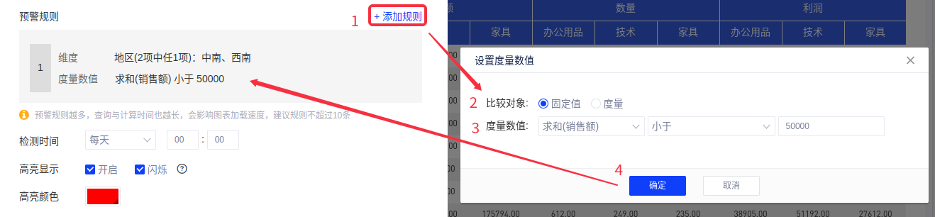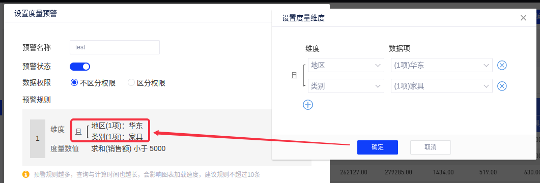 (1)以默认数据源为例,我们设置华东地区家具类目求和(销售额)与一个固定值的大小关系,然后系统会根据这个关系来进行预警。操作示例如下图: