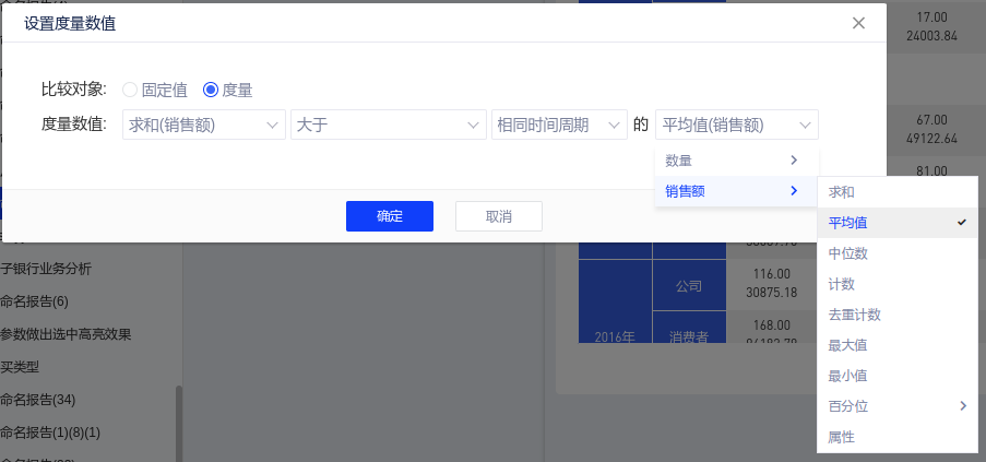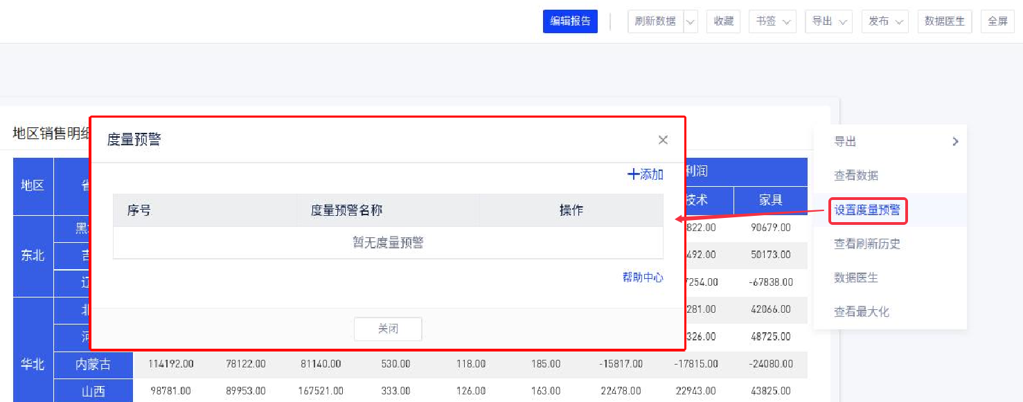 (1)在报告阅览页面,点击图表的右上角[更多操作]-[设置度量预警],弹出度量预警设置窗口;