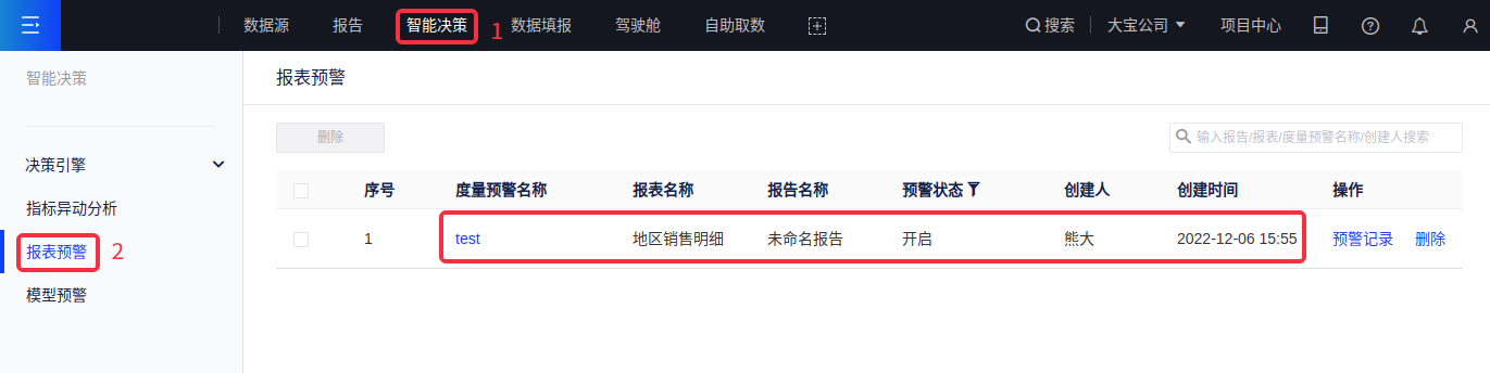 (5)您可在[智能决策-报表预警]模块列表中查看预警记录,对预警进行编辑与删除,搜索预警等功能。若预警出现失效度量或维度,则会显示为红色。