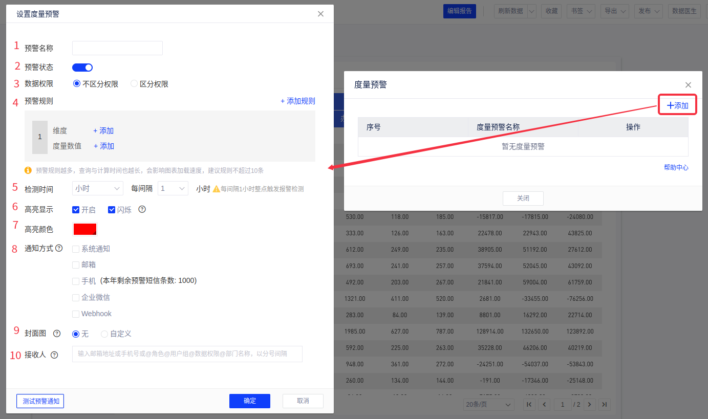 报表预警也叫做度量预警,主要功能是帮助我们监测数据中值的变化,提供小时、日、周、月粒度的实时监控,您可通过配置预警规则、检测时间设置预警,当数据中有满足条件的值时就会发出警报。