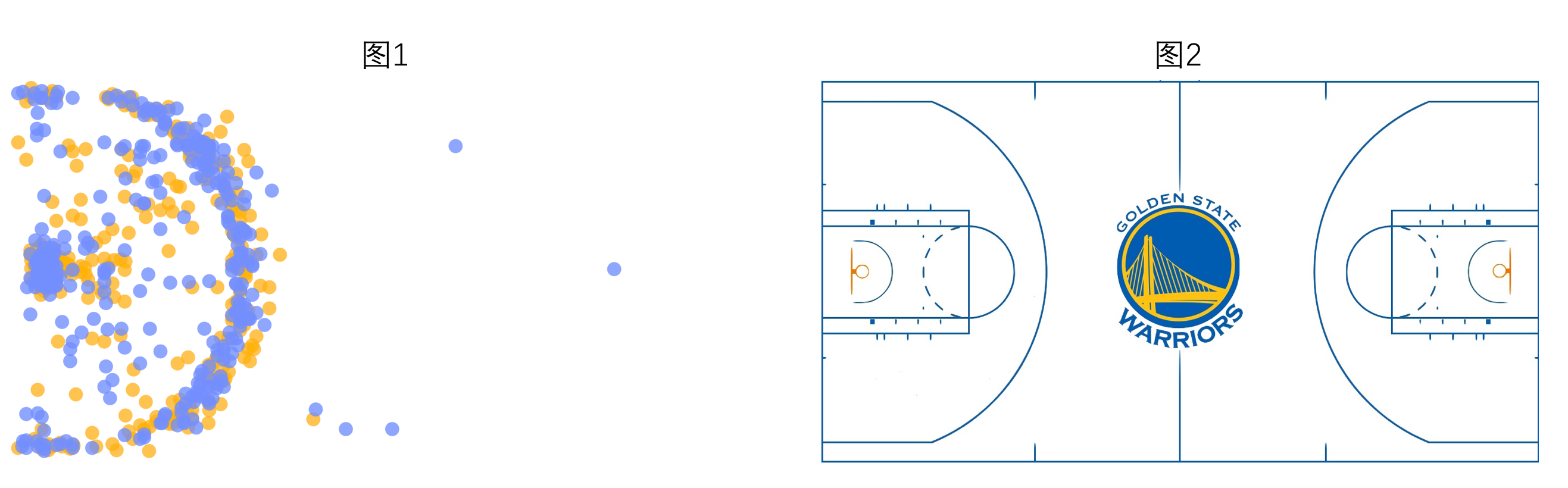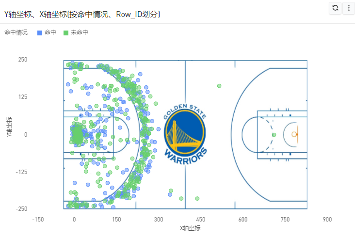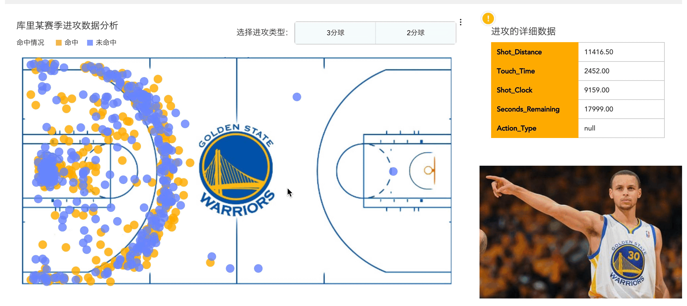 图中展示了库里某赛季的进攻数据。我们将篮球场地图作为图表的背景,每一个数据点表示库里在该位置发起了一次进攻,选中对应的数据点,右侧的表格会显示库里该次进攻的详细数据。通过自定义背景地图,我们可以更直观地分析库里的进攻行为。