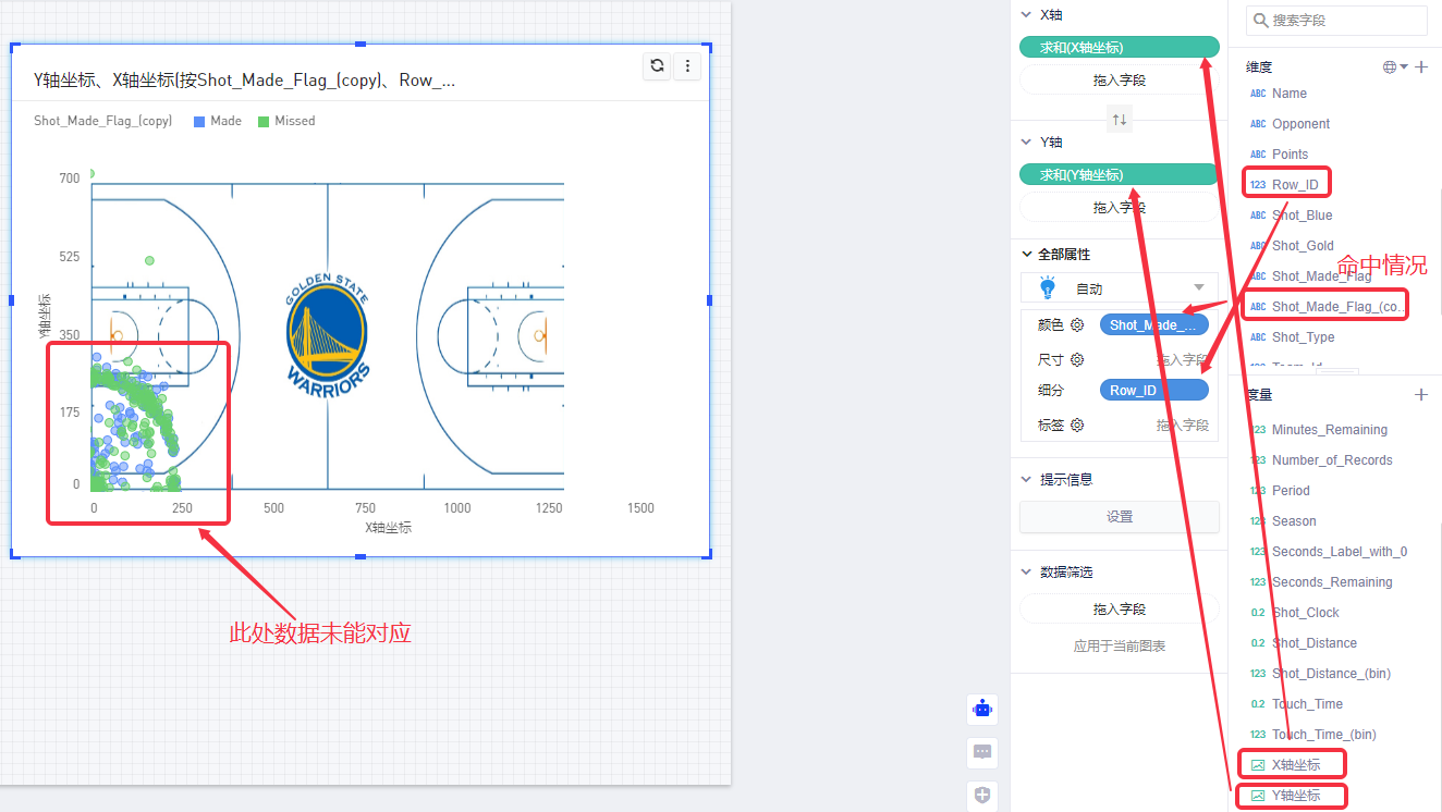 (5)但可以看到,数据点并未显示在图片的正确位置,且字段”Shot_Made_Flag(copy)”的内容需要翻译成中文。需要调整图片的显示位置和设置数据字典。