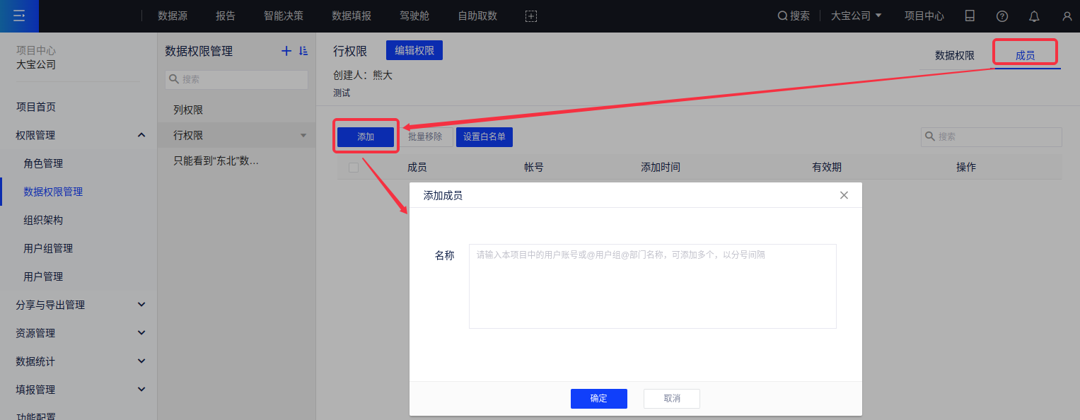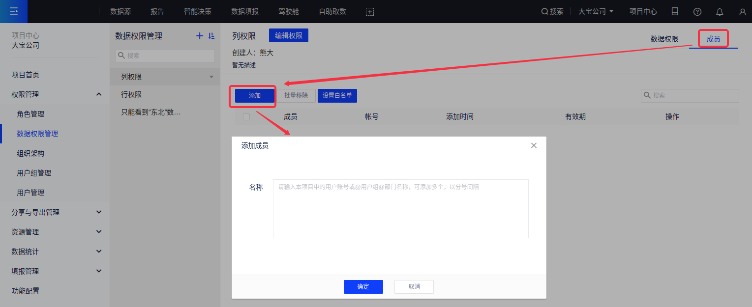 (3)设置好以上权限后,保存权限设置。然后可在右侧添加成员,则该成员即受该权限的限制;