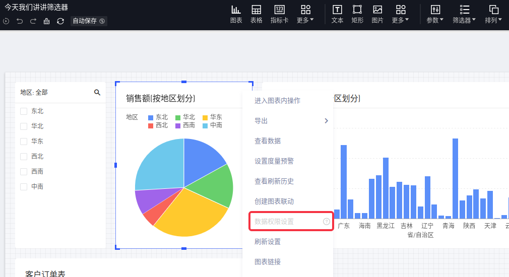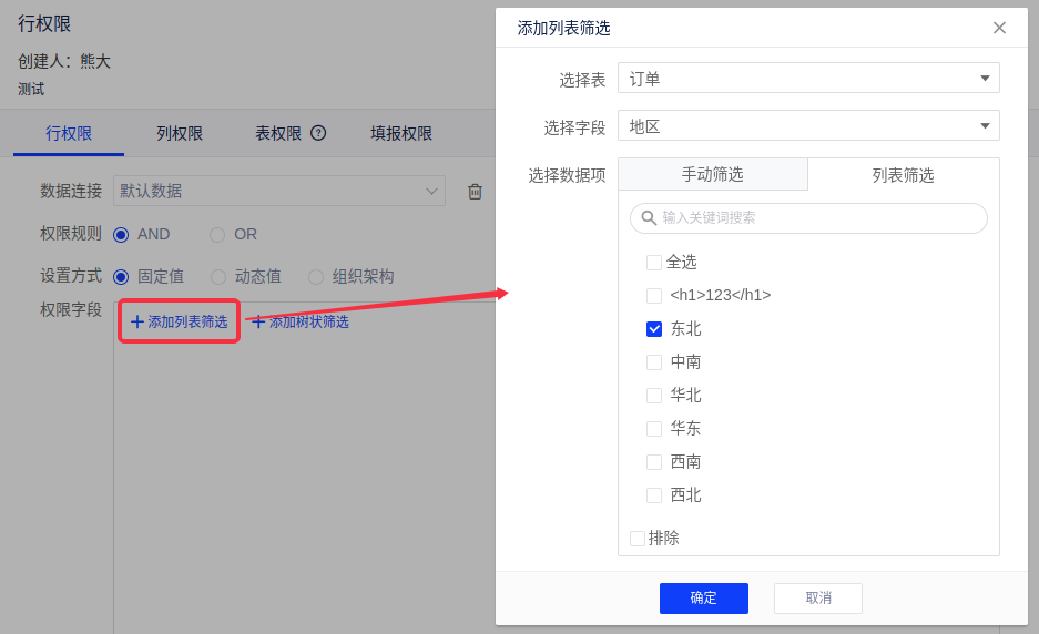 例1:添加列表筛选中【选择表】中选择“订单”,【选择字段】中选择“订单”下“地区”字段,【选择数据项】可手动输入“东北”或列表筛选勾选“东北”,将该“数据行级权限”赋予给东北大区的销售人员,则他们在访问相关报告时,只会看到“东北”地区的数据。