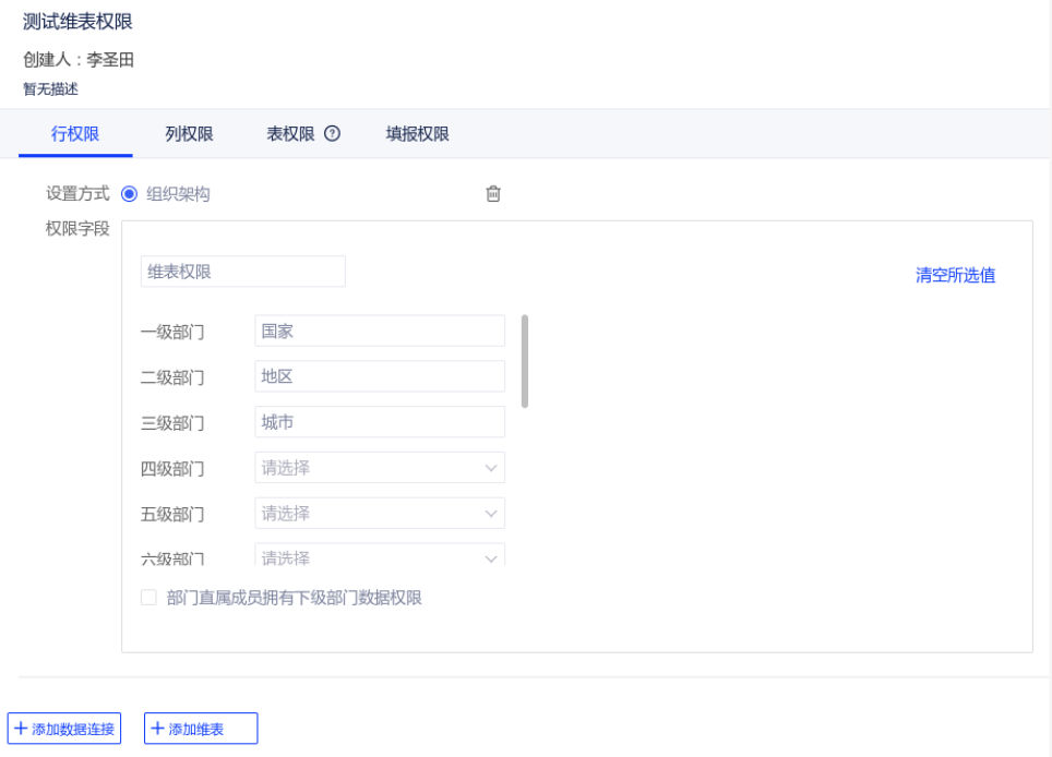 (2)行权限的添加方式选择“添加维表”,选择绑定过目标字段的维表后逐级匹配;