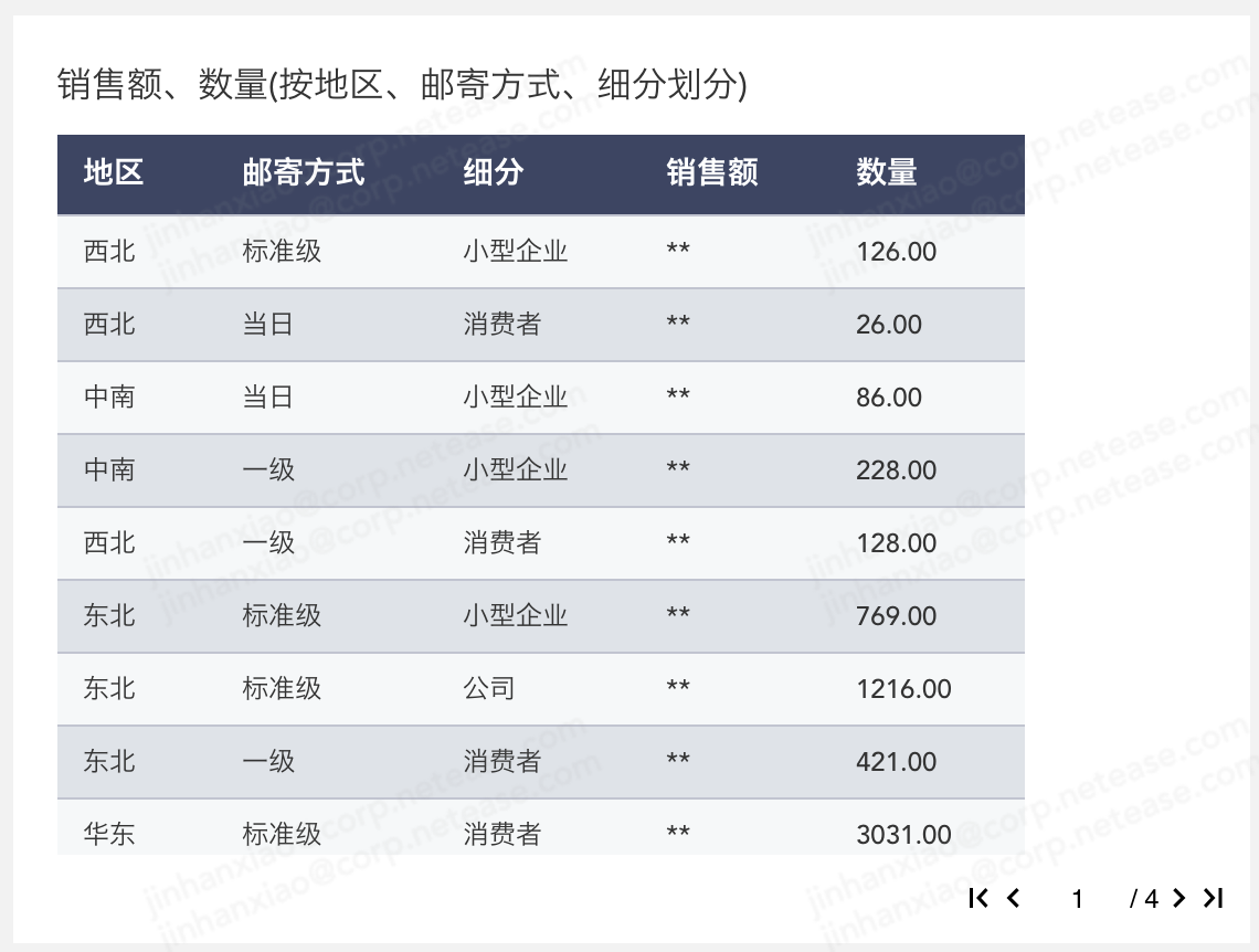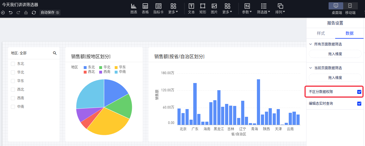 假设公司在“东北、华北、华东、华南”四个大区都有销售人员,我们希望不同大区的销售访问同一张报告时候只能看到自己所属大区的数据,用“数据行级权限”可以实现这样的需求,创建4个“数据行级权限”,每个“数据行级权限”只能访问一个大区的数据,然后给不同大区的销售人员分配对应的“数据行级权限”。